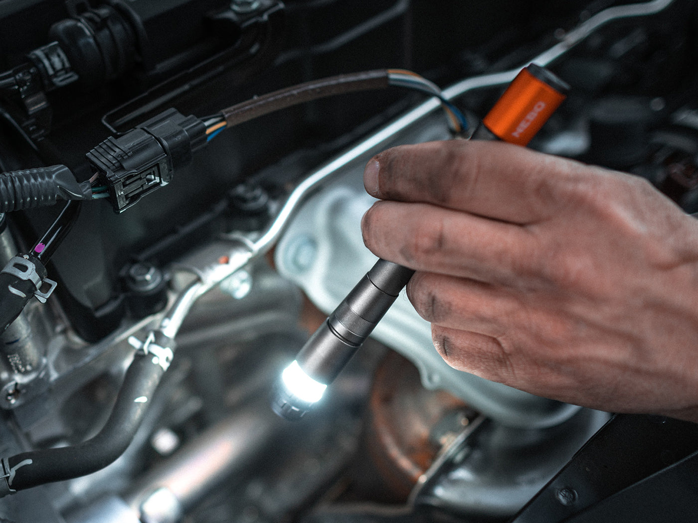 Nebo Inspector 500 is een klein maar krachtige Penlamp met grootse prestaties. De zaklamp beschikt over een hoogwaardige geanodiseerde aluminium constructie, deze oogt niet alleen aantrekkelijk maar is ook nog eens erg robuust. Door aan de kop van de Inspector te trekken gaat de body open en wordt het werklamp gedeelte zichtbaar, hiermee kun je een locatie 360 ° verlichten. Op de achterzijde zit een magneet zodat deze lamp aan metalen oppervlakten opgehangen kan worden. De lamp is oplaadbaar en geeft aan wanneer de lamp vol is doormiddel van lichtsignalen ( Rood = Aan het opladen, Blauw = Volledig opgeladen). Door het Flex-Power systeem kan deze lamp ook gebruikt worden met 2x AAA alkaline baterijen ( Let op niet oplaadbaar ). De lamp kan zowel in de hoge stand ( knop eenmaal indrukken ) als in de laagste stand (knop vasthouden) aangezet worden. Verder kan de turbostand bereikt worden door de knop vast te houden als de lamp aan staat, de strobe stand wordt bereikt door de aan/uit schakelaar 2 maal snel in te drukken. De lamp is IPx7 waterdicht en wordt geleverd met een omkeerbare draagclip.