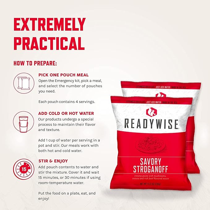 Het bereiden van deze maaltijden is eenvoudig en vereist minimale middelen. Veel van de gerechten kunnen worden bereid met alleen water en een warmtebron, zoals een kooktoestel of kampvuur. Dit maakt het ReadyWise Noodrantsoen ideaal voor gebruik in verschillende omgevingen, van noodsituaties tot outdooravonturen.